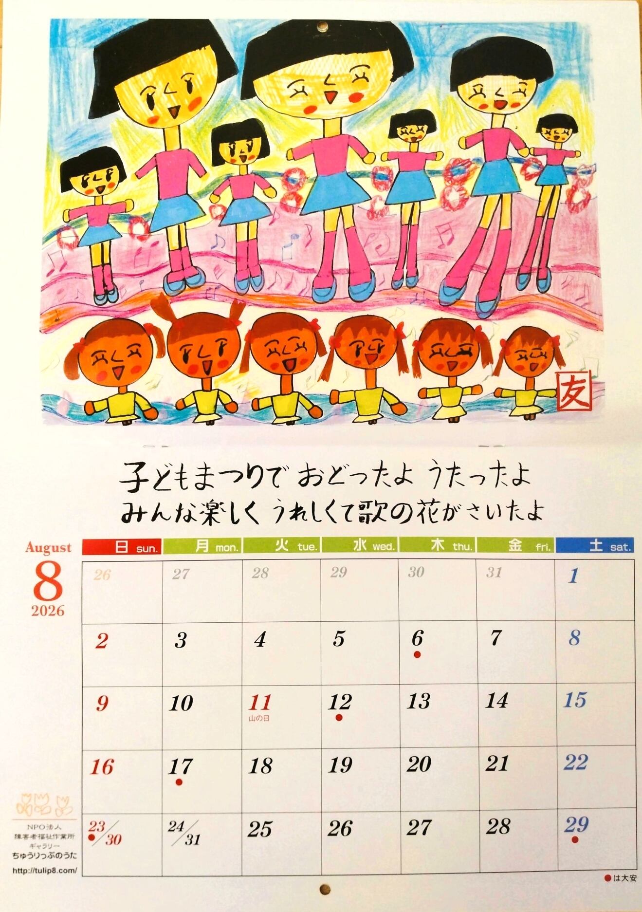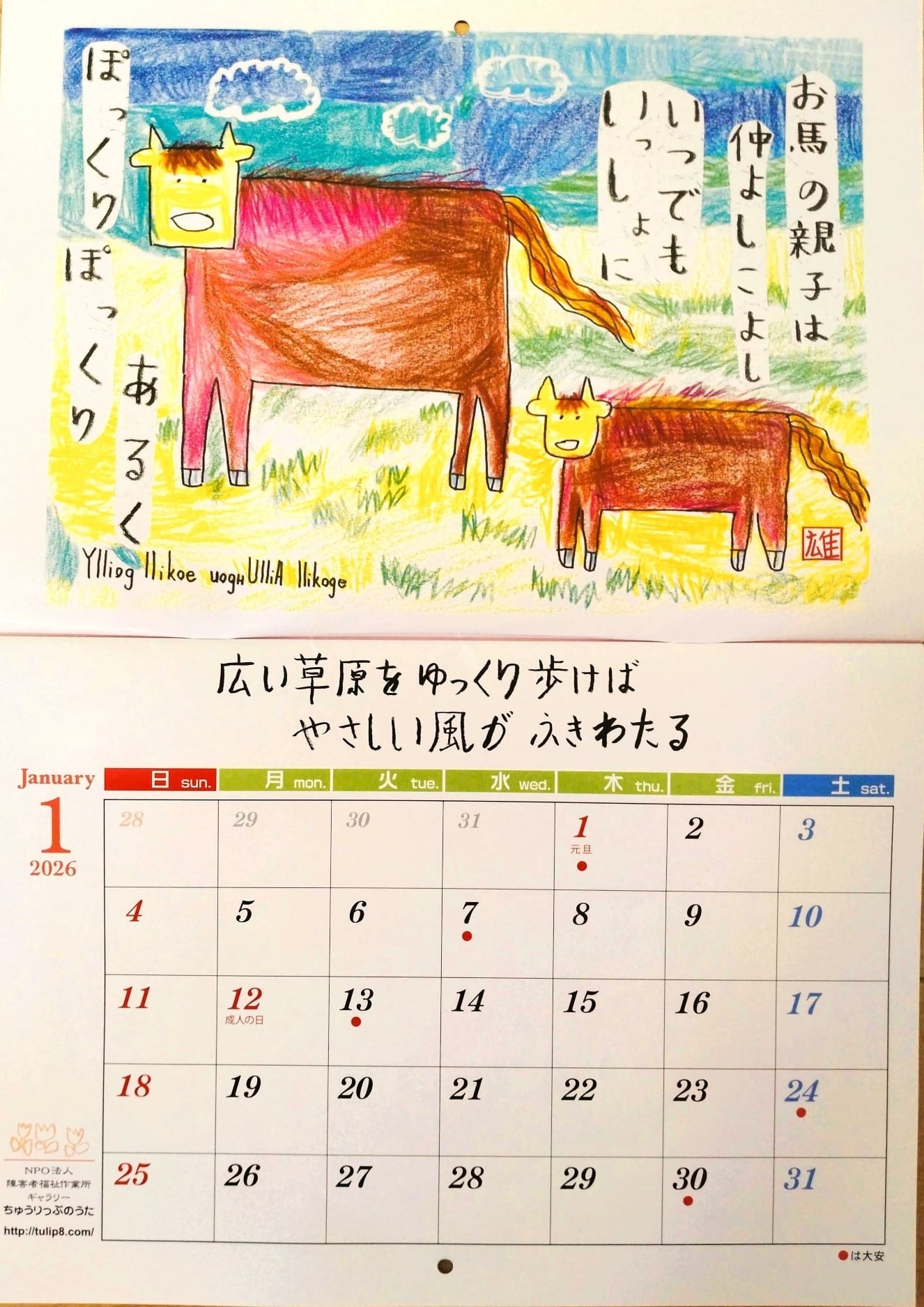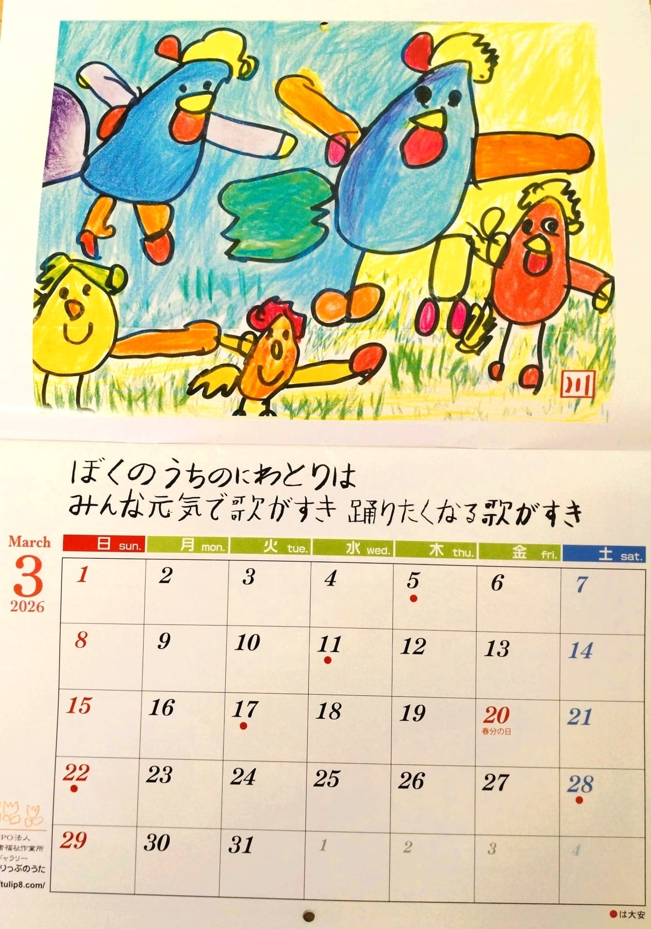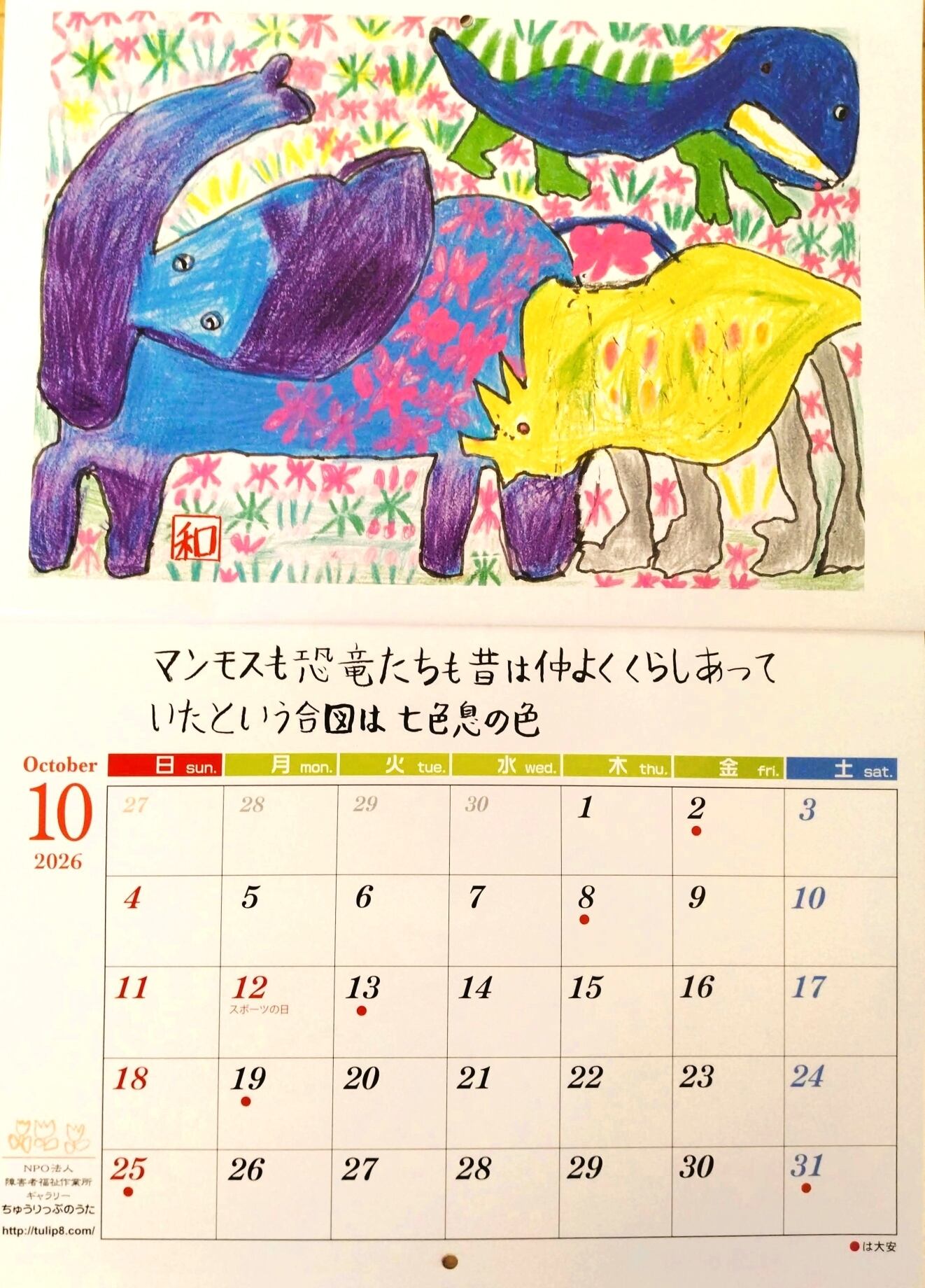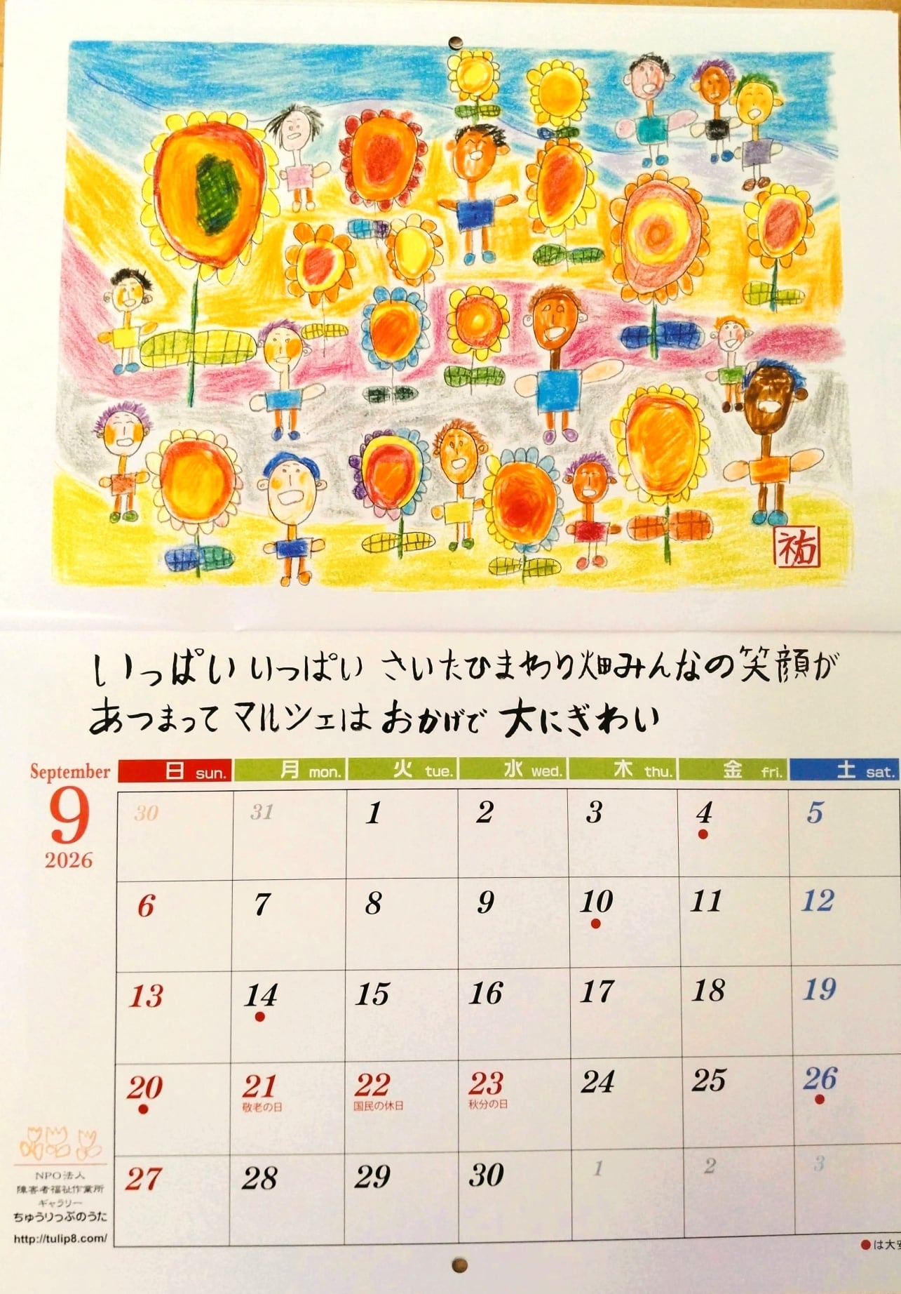 福祉作業所ちゅうりっぷのうたの利用者さんが描いた絵を使ったオリジナルカレンダーです。
