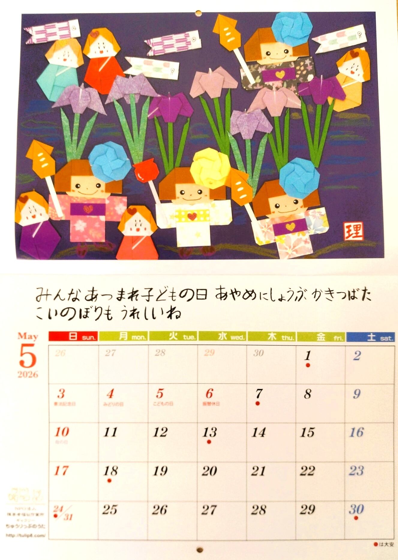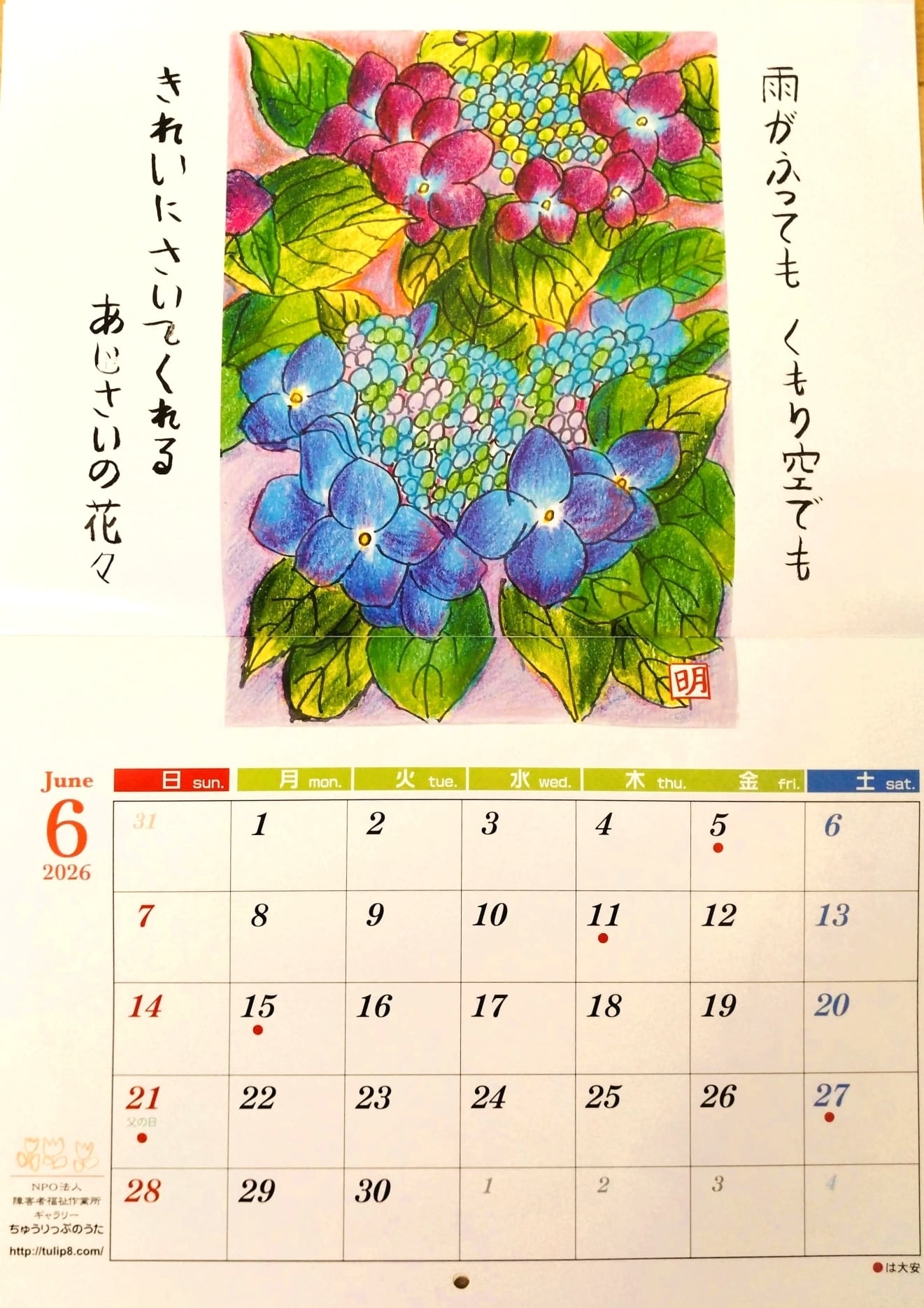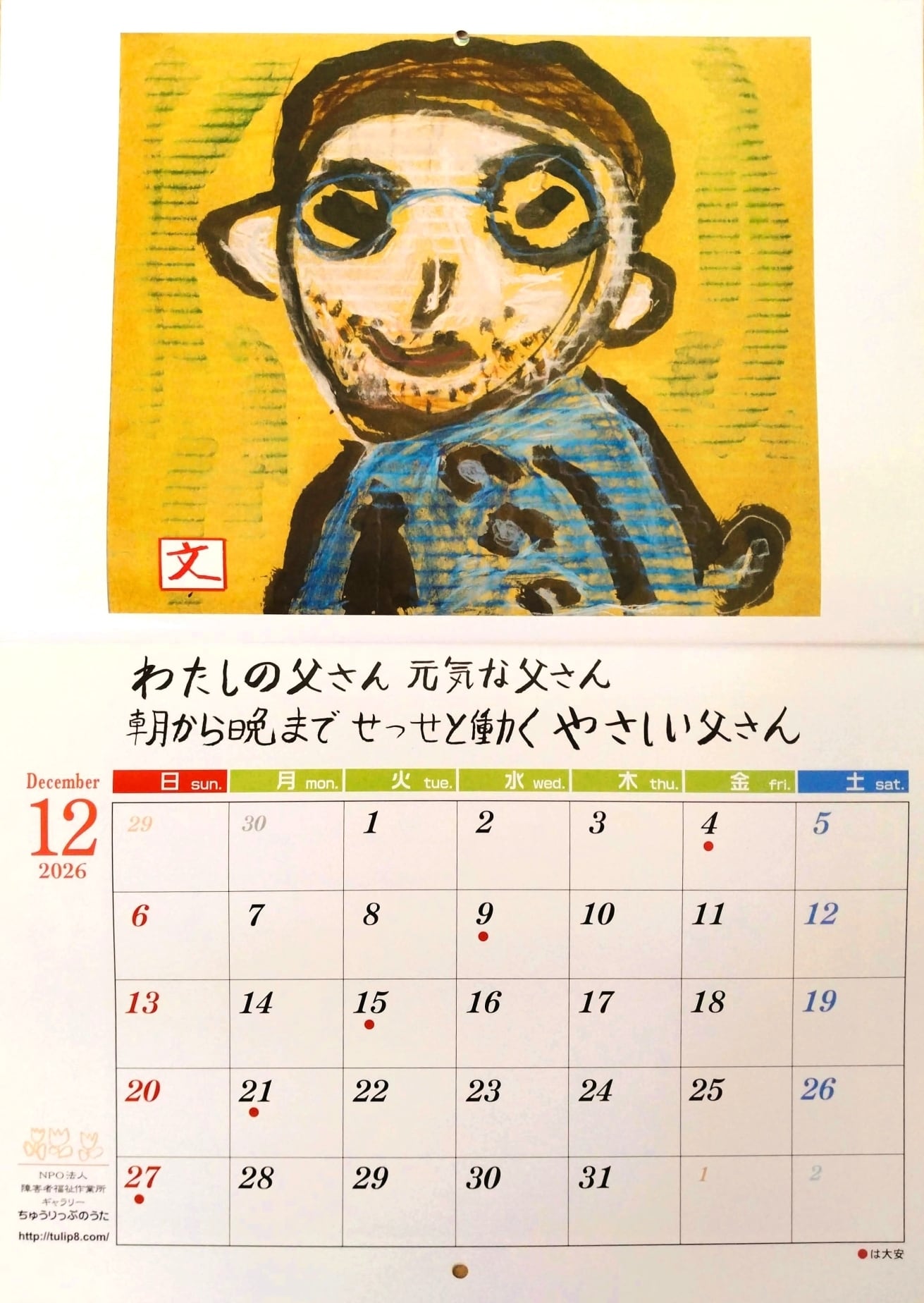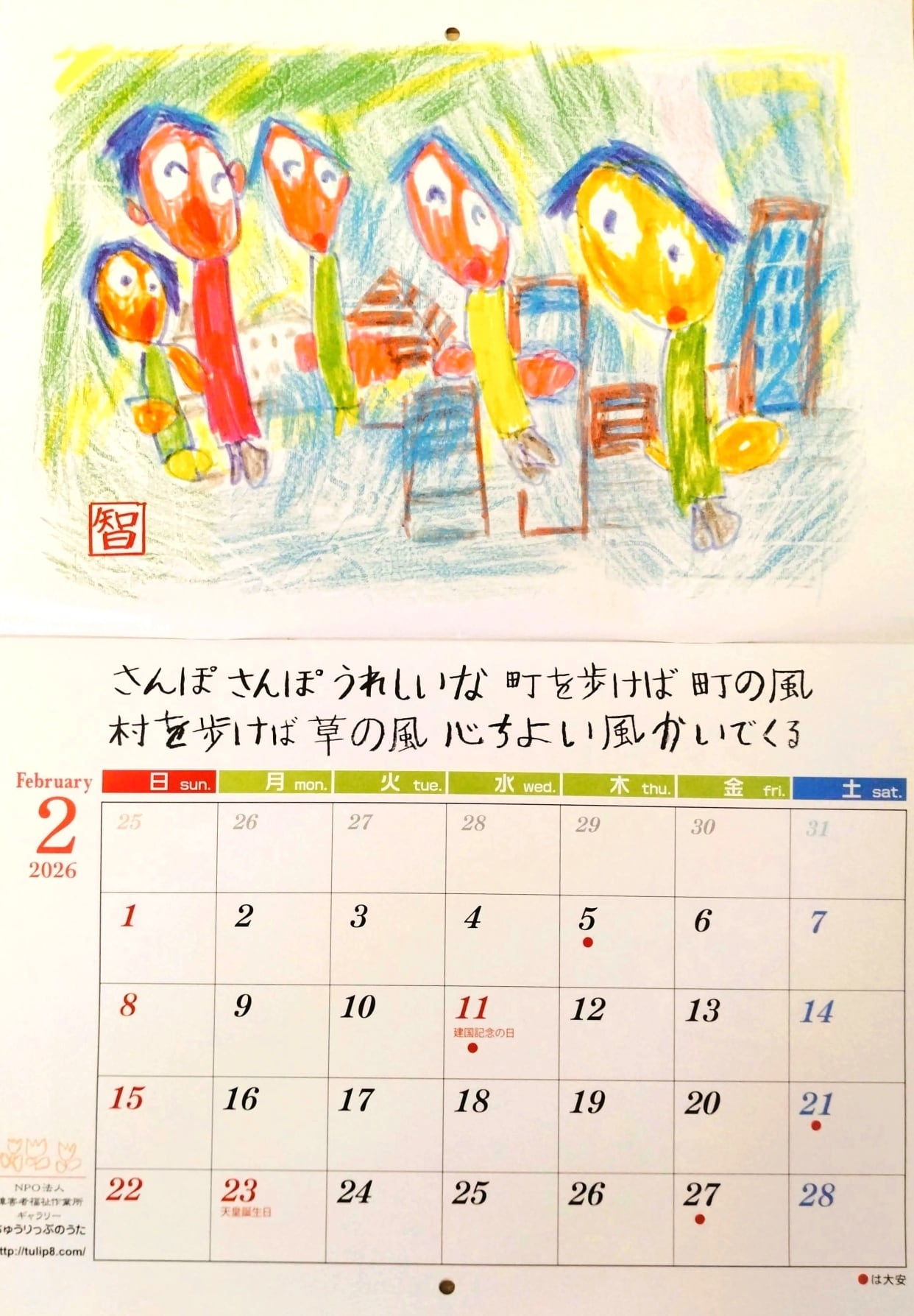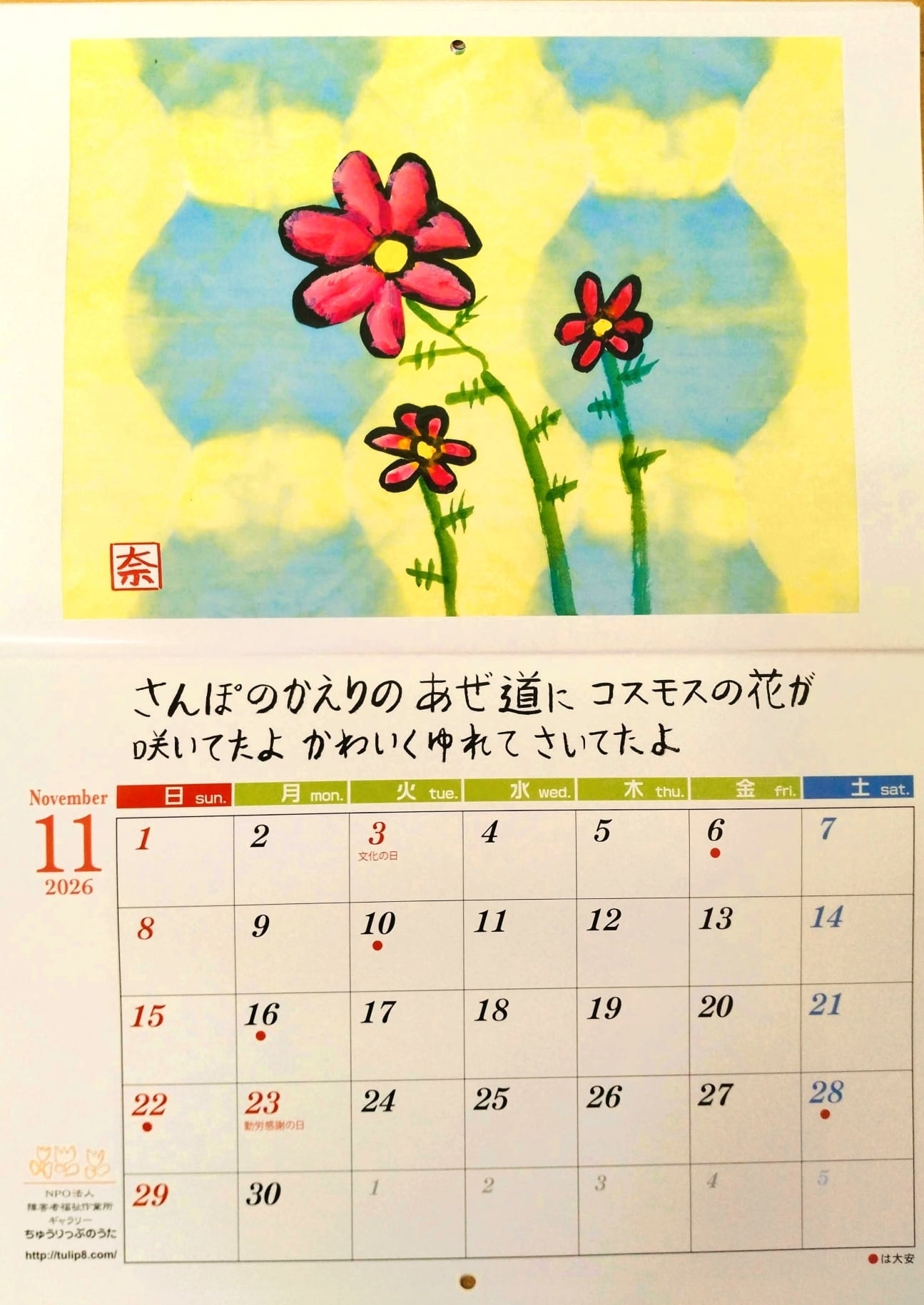 福祉作業所ちゅうりっぷのうたの利用者さんが描いた絵を使ったオリジナルカレンダーです。